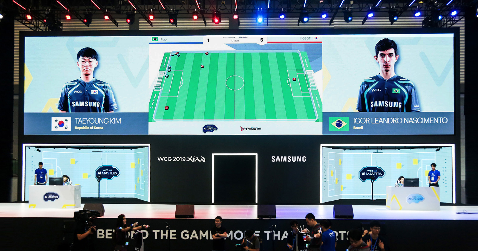 The main concern of the WCG New Horizons’ team was how to take previously unknown or unpopular esports genres like AI, VR, and Robot Fighting and present them in a way that would sync with general esports audiences. There was the somewhat monotonous, research intensive Artificial Intelligence field, the difficult to observe Virtual Reality titles, and the unconventional sport of robot fighting. We had to find an element that made these three genres ‘fun to watch’ so normal audiences would be able to more easily connect with these forms of esports. To do this, we tackled each genre individually. For AI, we created a soccer tournament in which teams would code artificial intelligence programs to play against other AI-controlled teams. VR received a visual boost with our LED Mixed Reality screens, which we designed with three separate screens joined together to form a 180 degree athlete POV to immerse audiences in the game. Finally, for Robot Fighting, we created an arena where athletes took their place right outside the cage to allow for both robot and fighter to be viewed at the same time.